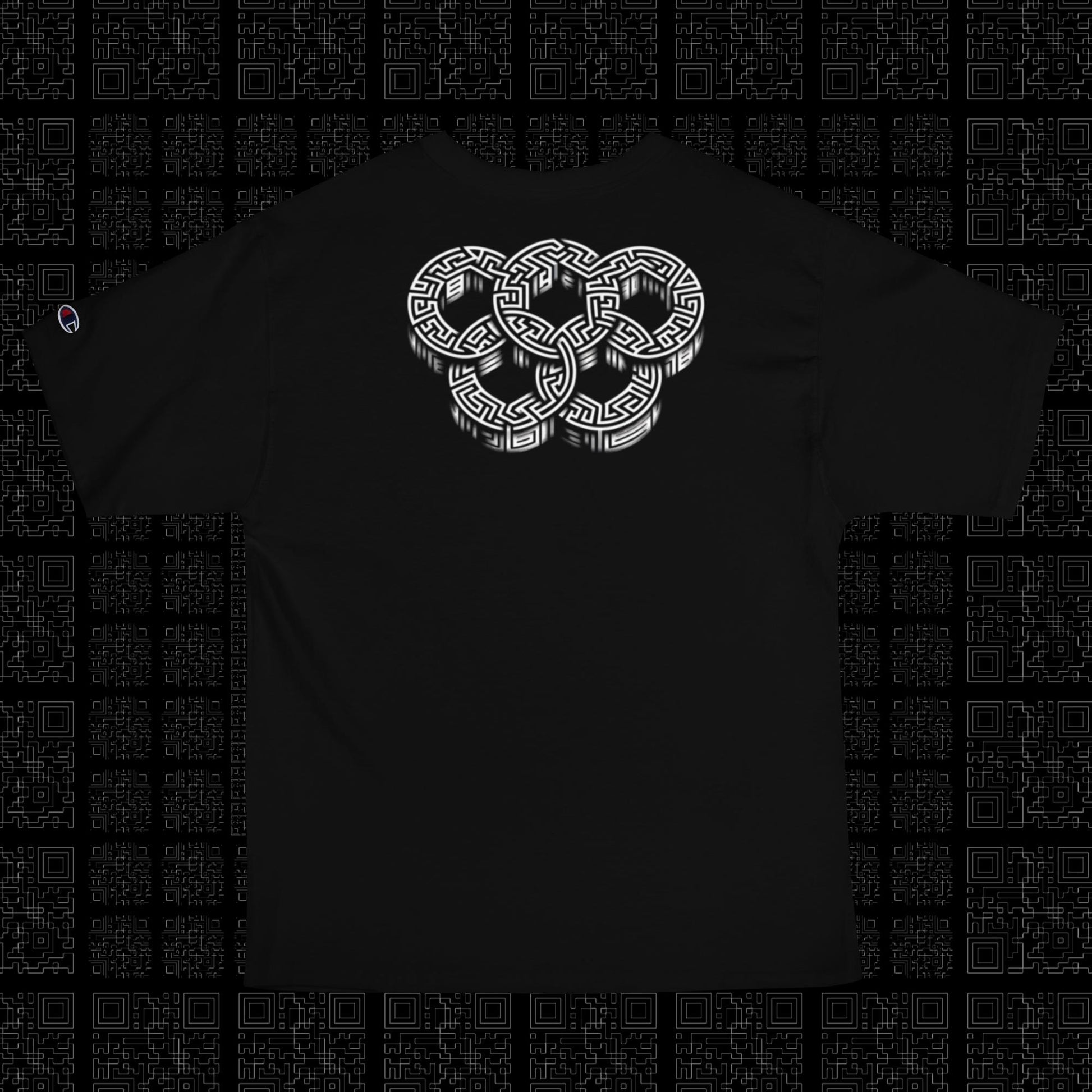 The t-shirt showcases an artistic rendition of the Olympic rings in an elegant black and white style. The rings are interlinked in a creative, abstract form, giving the traditional symbol a modern twist. Each ring features intricate patterns such as hatching or stippling, adding texture and depth against a stark white background.