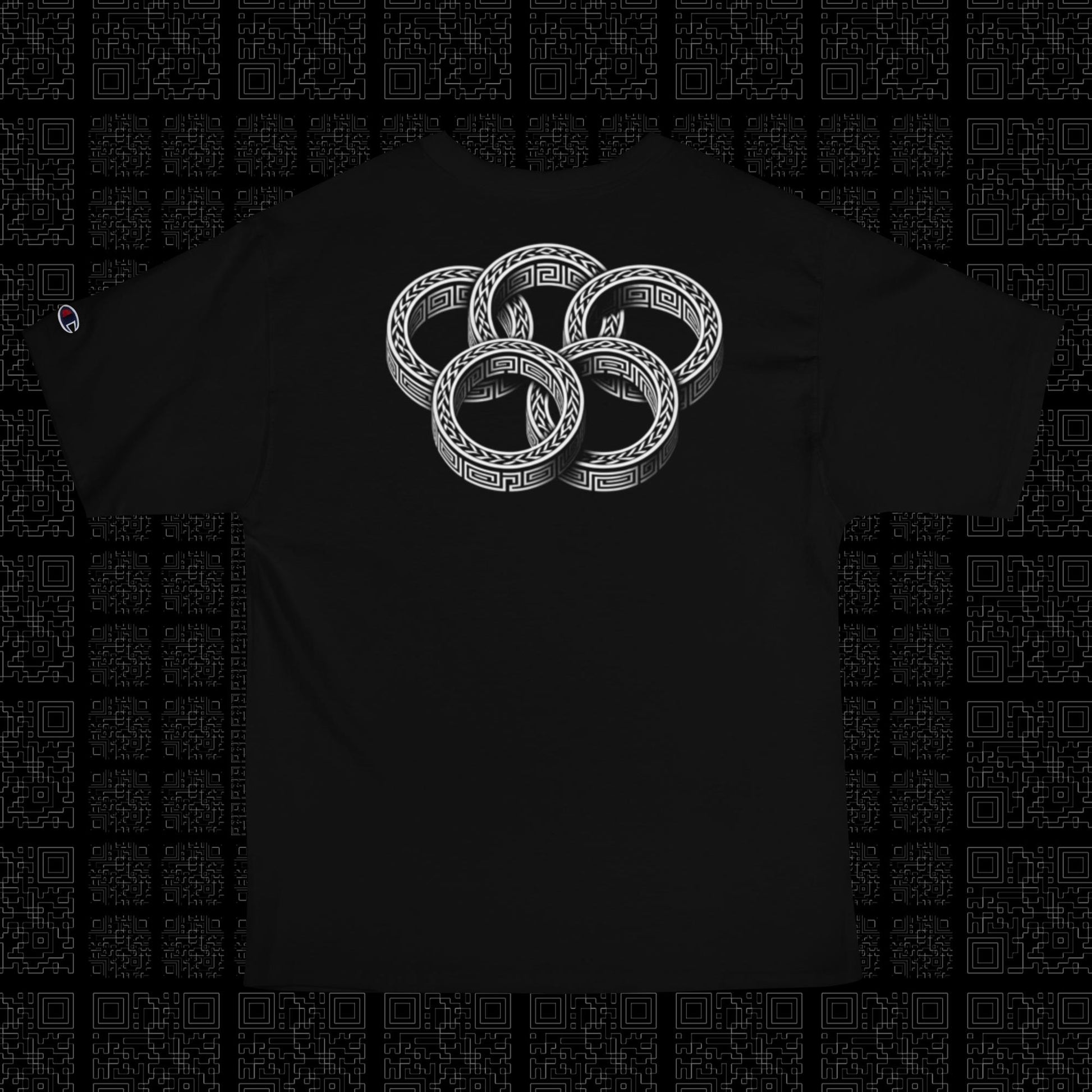 The t-shirt showcases an artistic rendition of the Olympic rings in an elegant black and white style. The rings are interlinked in a creative, abstract form, giving the traditional symbol a modern twist. Each ring features intricate patterns such as hatching or stippling, adding texture and depth against a stark white background.